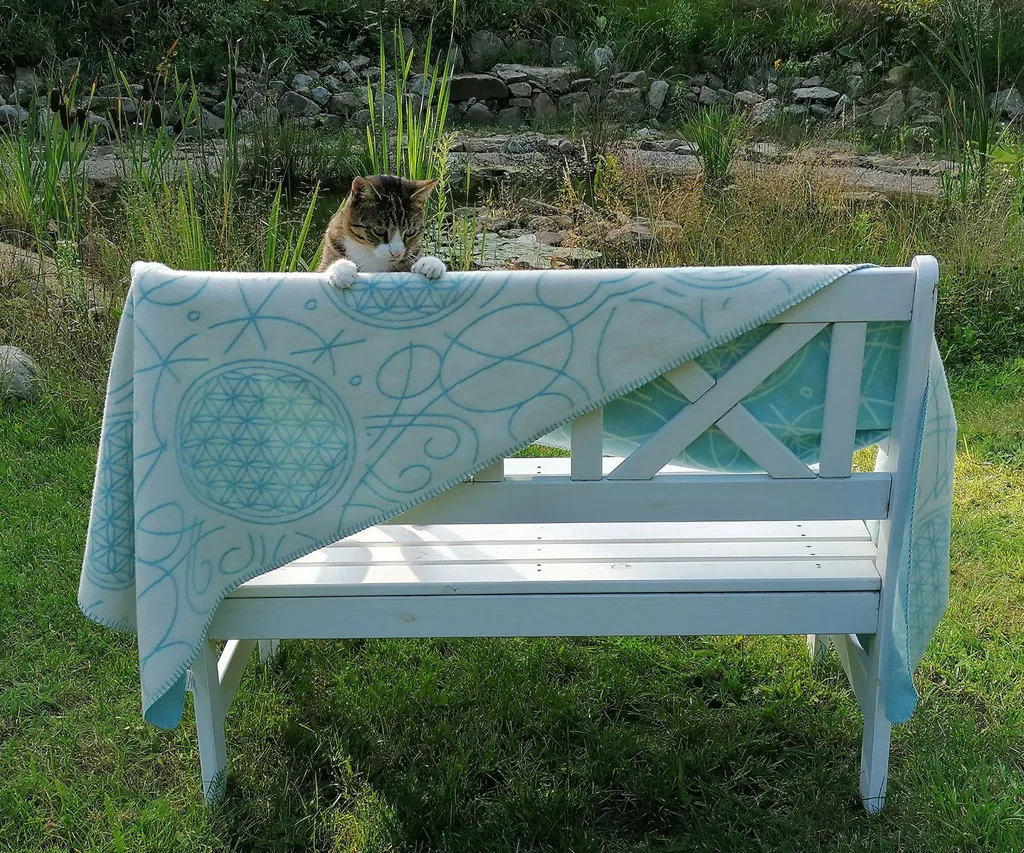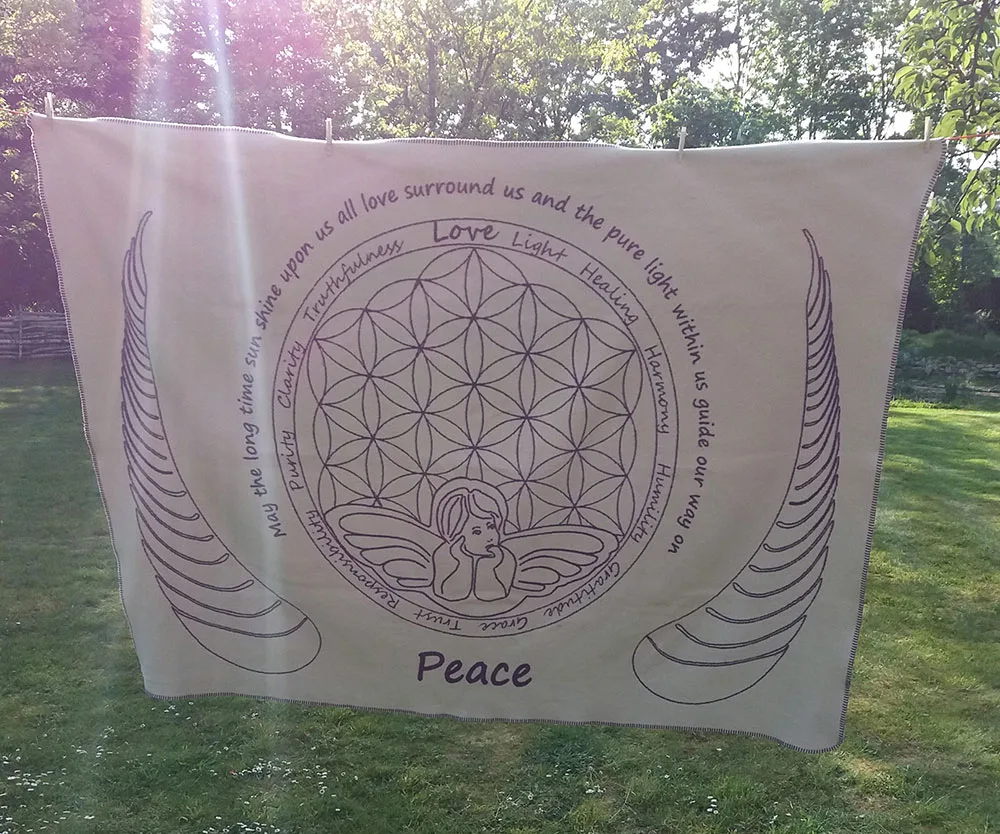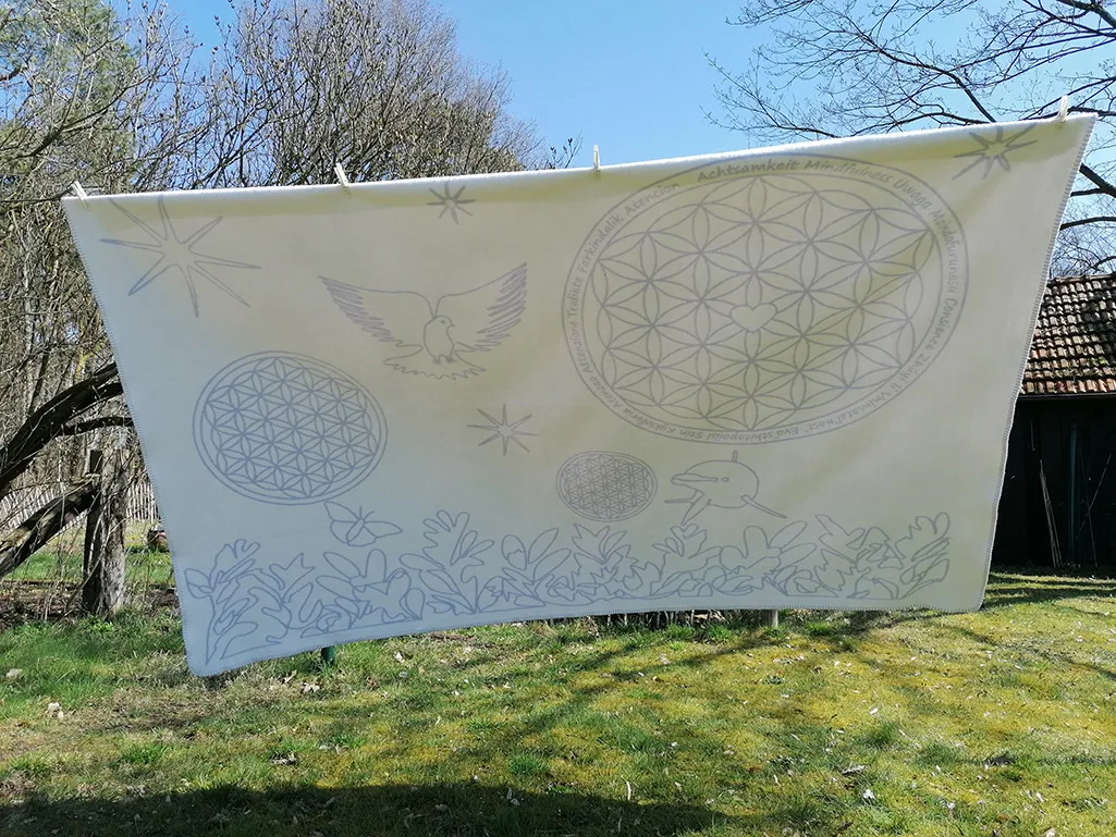De combinatie van het 100% biologisch katoen, de Levenbloem en de kleur in verbinding met de individuele lichaamscellen maken van elke deken een soort energetische wegwijzer. Elke deken heeft een eigen werking.